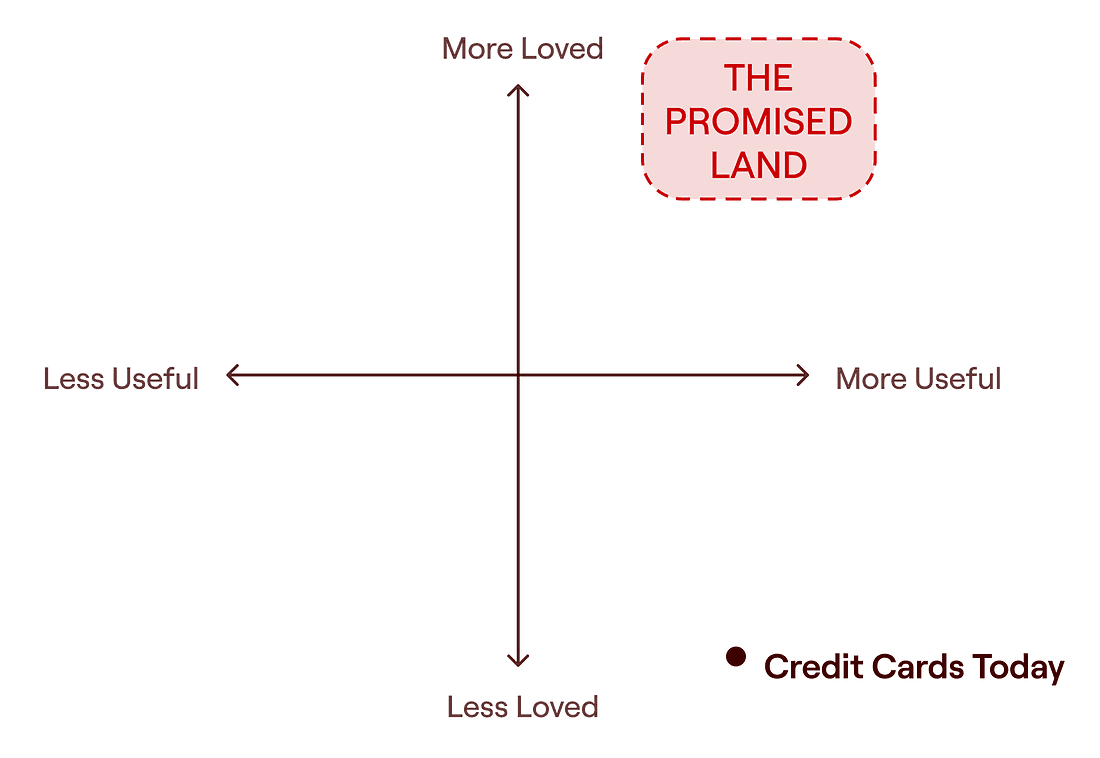 One way we like to think about design at Cardless is on a two-dimensional graph: the X-axis is how useful a product is, and the Y-axis is how loved it is. Products in the top right corner are both loved and useful: we call it the promised land. Think of a product that you use every day—one you would wholeheartedly recommend to your friends. That’s the promised land.